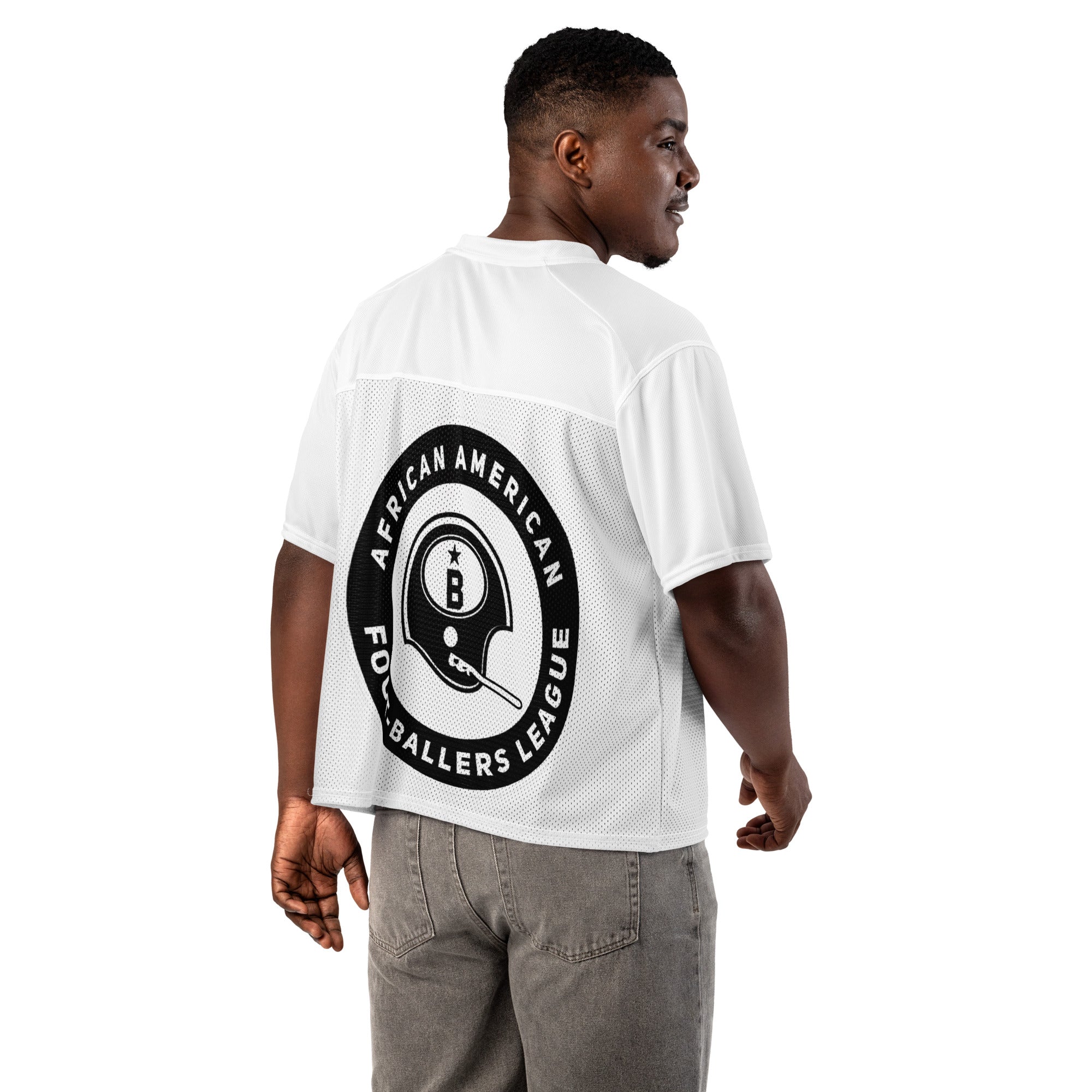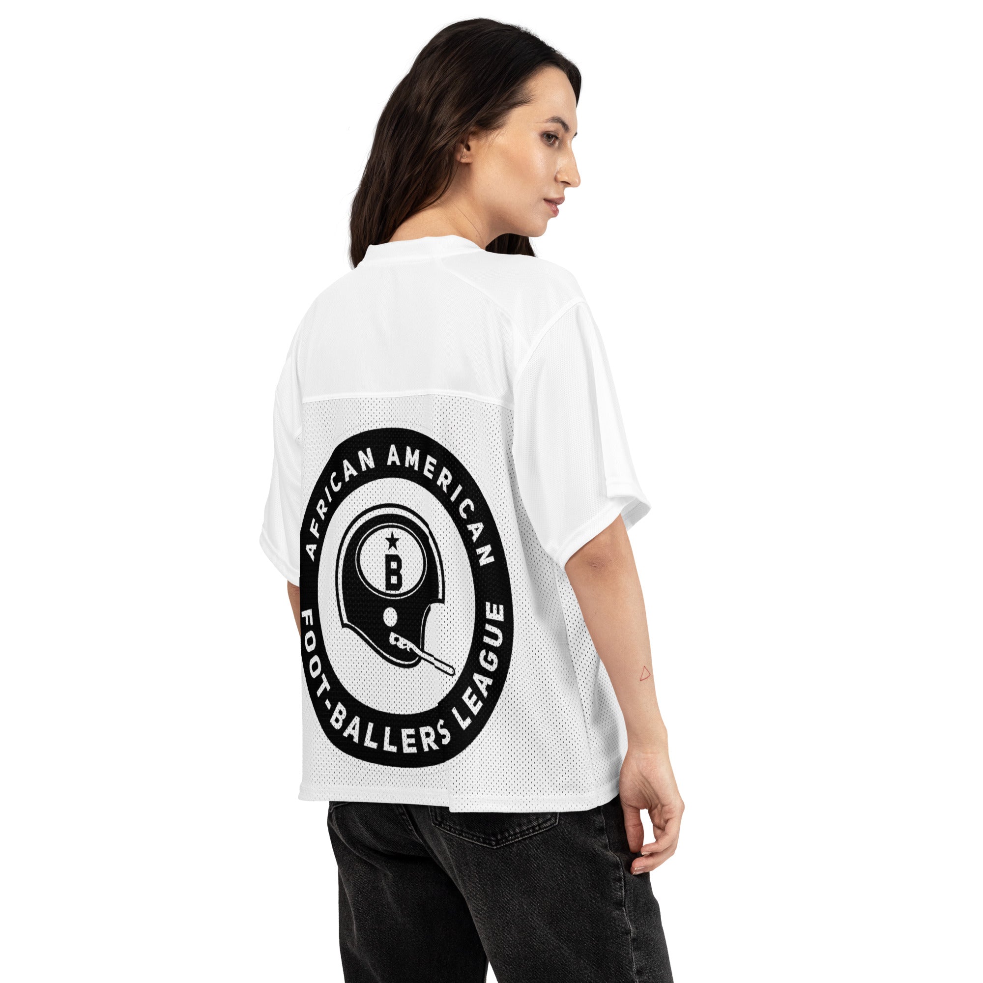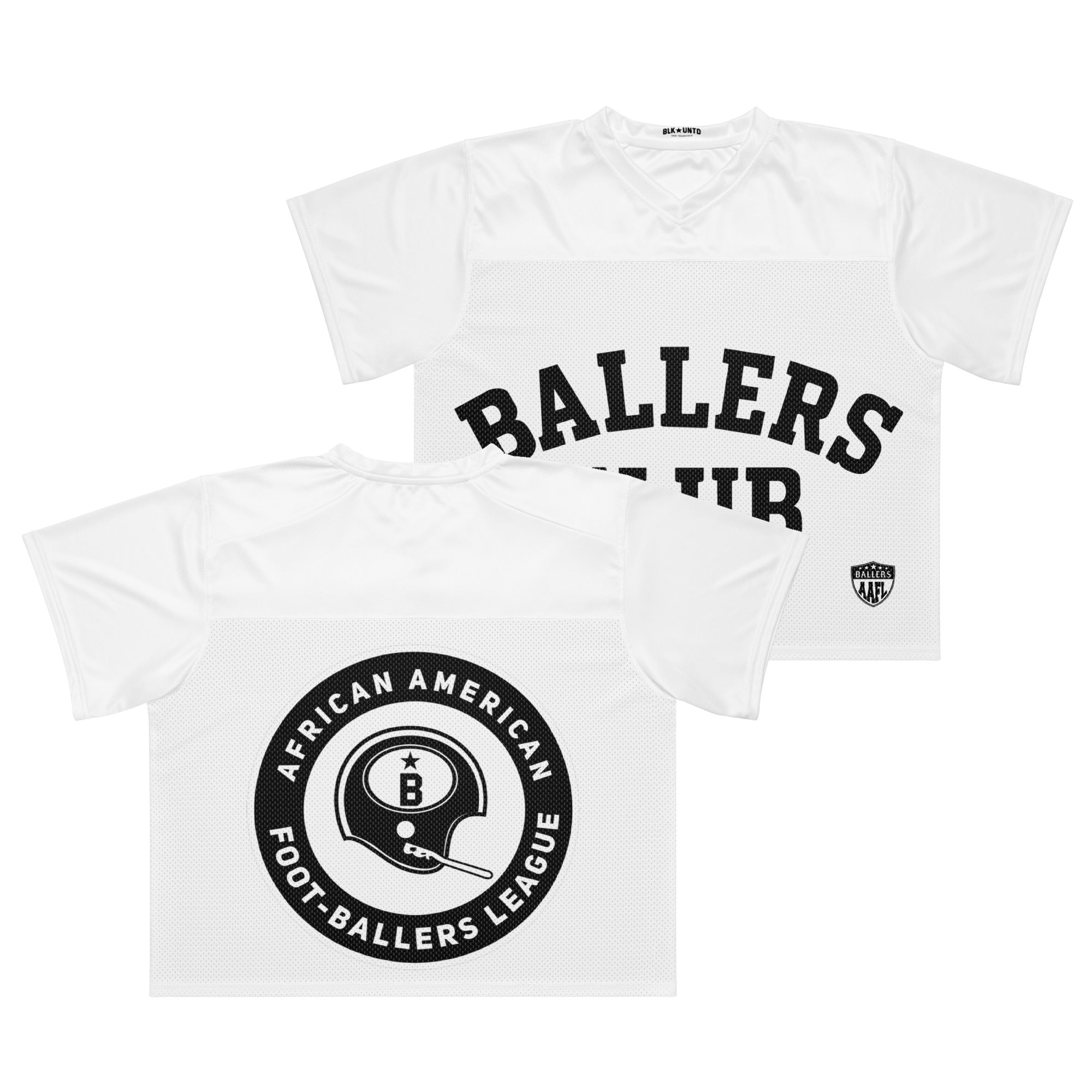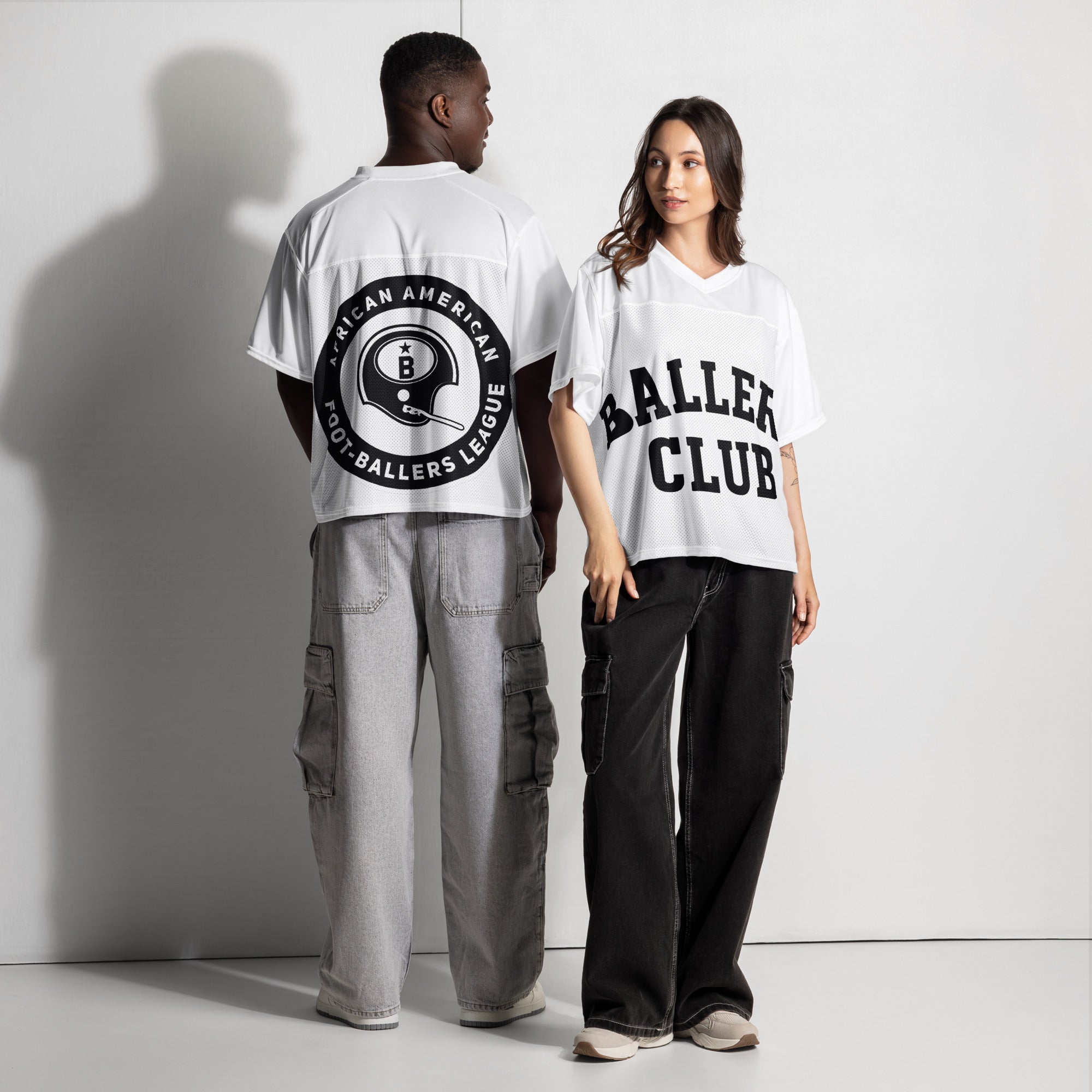 A Vintage vibe with airy comfort. This breathable boxy football jersey is perfectly crafted with silky top fabric and heavy mesh bottom. Moisture-wicking, 2-way stretch, and relaxed fit. Oversized BALLERS CLUB logo on front and AAFL League shied of honor on its back.
